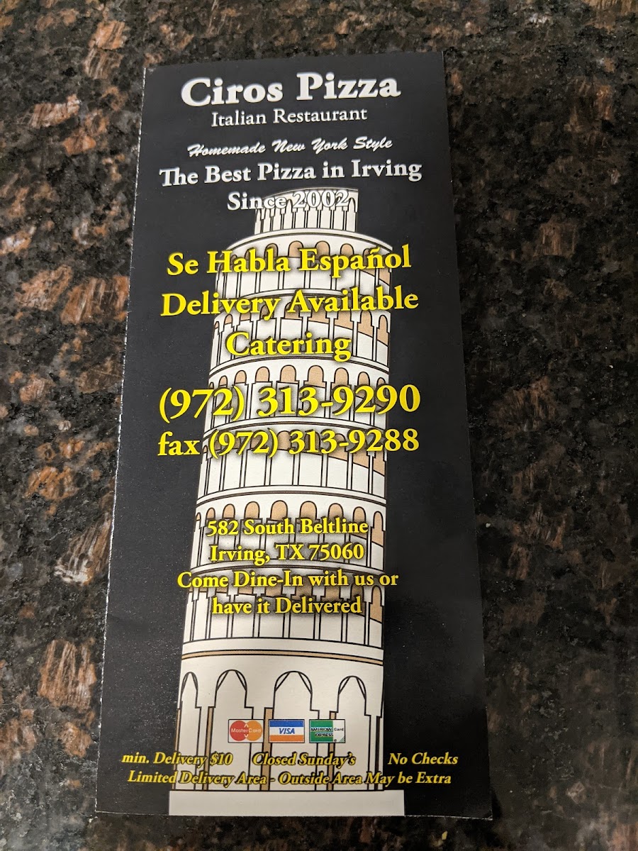 Welcome to Ciros Pizzeria, a hidden gem located at 582 S Belt Line Rd, Irving, TX. This charming eatery offers an extensive menu that goes beyond traditional pizza, showcasing authentic Italian cuisine crafted with love. Customers rave about the large, flavorful pizzas, known for their soft, thin crust and unique cheese blend, which combines mozzarella with provolone for a delightful taste experience. Reviewers have praised the slightly spicy red sauce that enhances every bite.